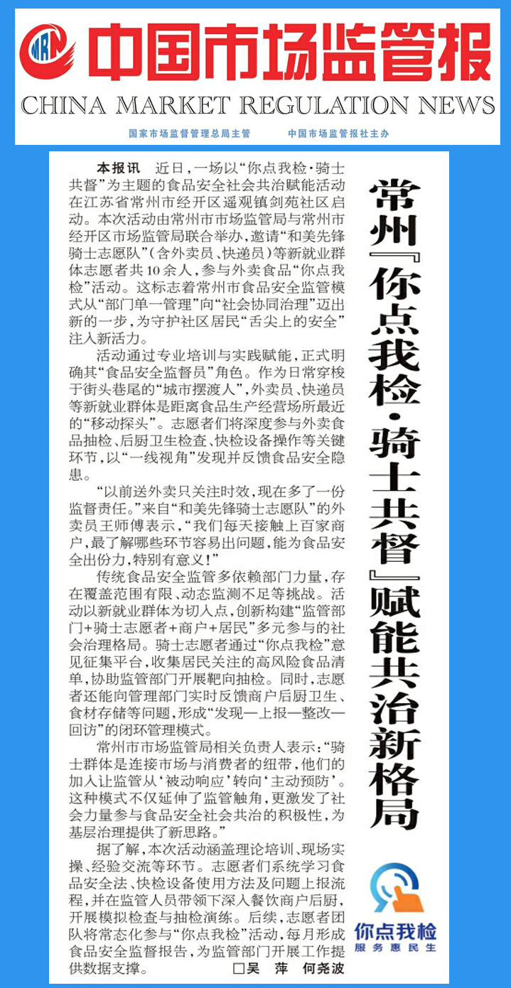10月15日,《中国市场监管报》以《常州“你点我检·骑士共督”赋能共治新格局》为题,报道常州“你点我检·骑士共督”活动。