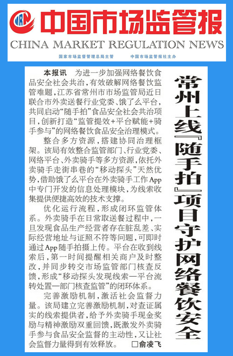| 《中国市场监管报》报道常州上线“随手拍”项目守护网络餐饮安全 |