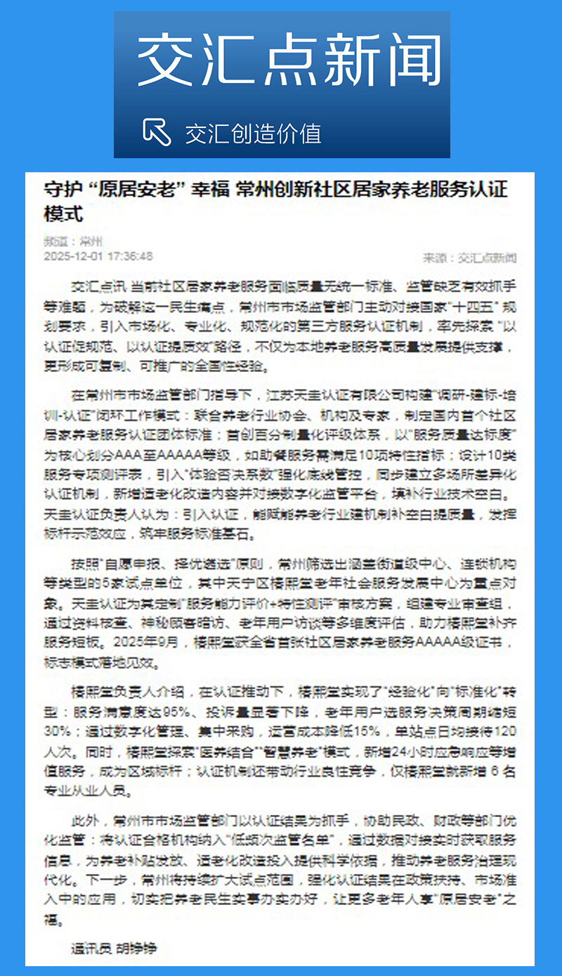 12月1日,交汇点新闻以《守护“原居安老” 幸福 常州创新社区居家养老服务认证模式》为题,报道常州社区居家养老服务机构服务质量认证试点成效。