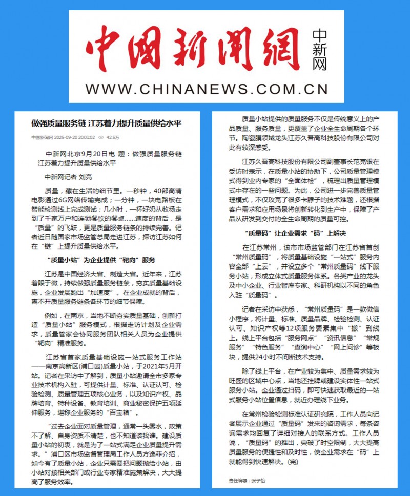 9月20日,中国新闻网《做强质量服务链 江苏着力提升质量供给水平》报道中,提及“常州质量码”服务情况。