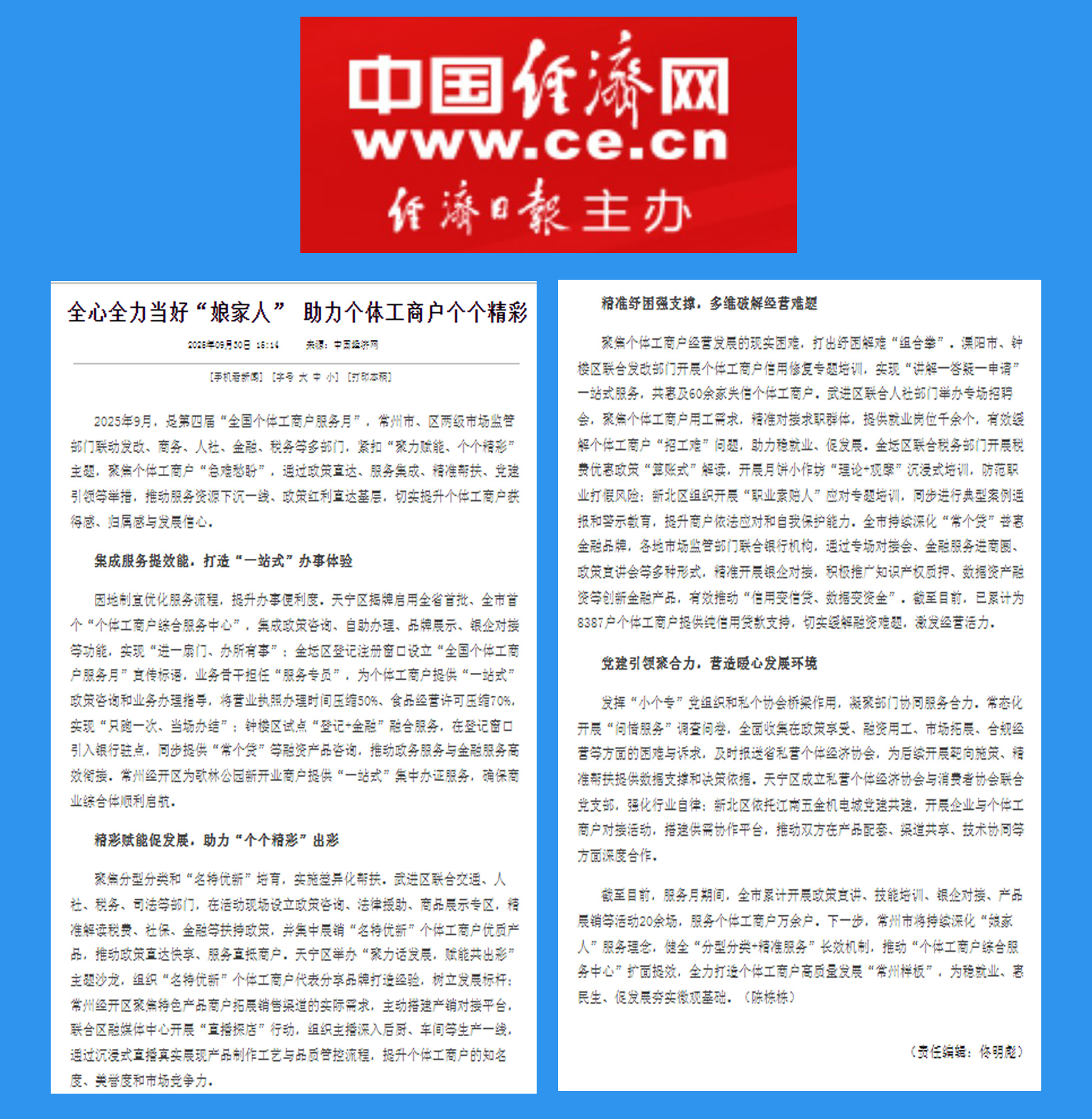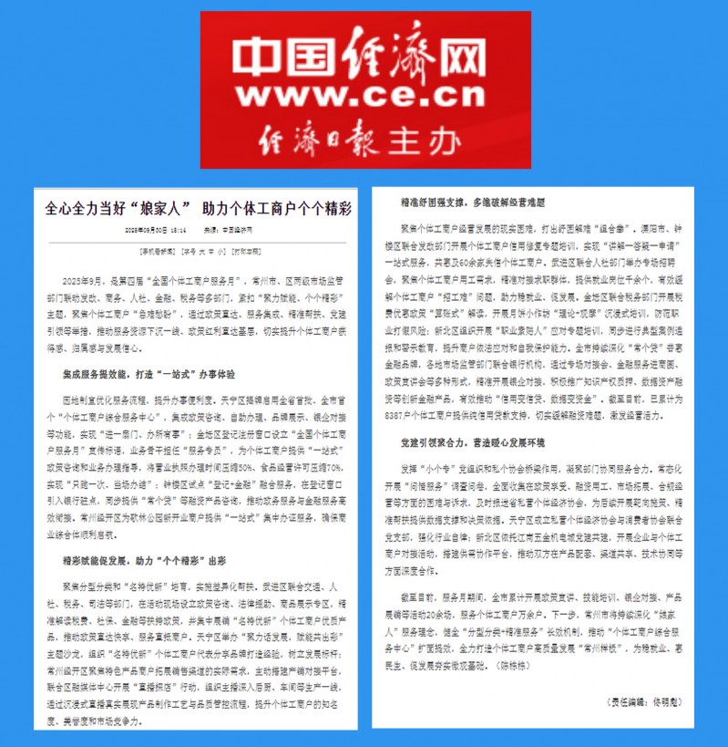 9月30日,中国经济网以《全心全力当好“娘家人” 助力个体工商户个个精彩》为题,报道第四届“全国个体工商户服务月”常州活动情况。