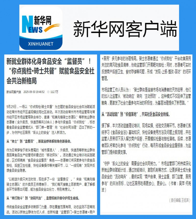 9月30日,新华网客户端以《新就业群体化身食品安全“监督员”!“你点我检·骑士共督”赋能食品安全社会共治新格局》为题发布报道。