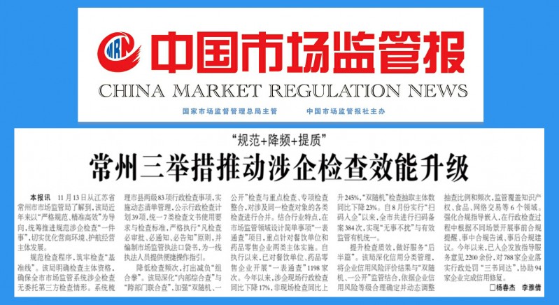 11月14日,《中国市场监管报》以《“规范+降频+提质” 常州三举措推动涉企检查效能升级》为题,报道常州市市场监管局统筹推进规范涉企检查“一件事”相关情况。