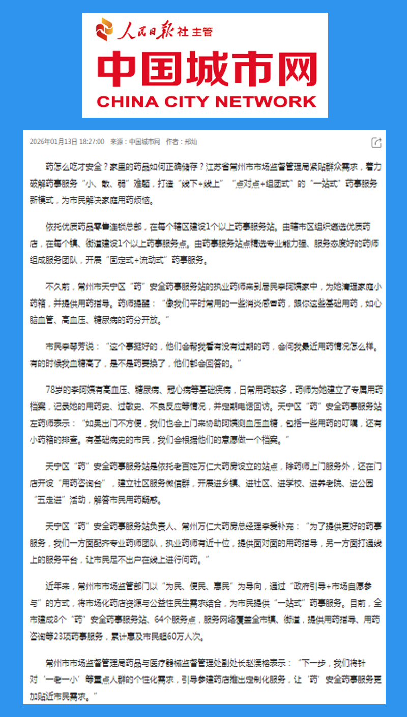 1月13日,中国城市网以《惠及市民超60万人次 江苏常州推行“一站式”药事服务》为题,发布相关报道。