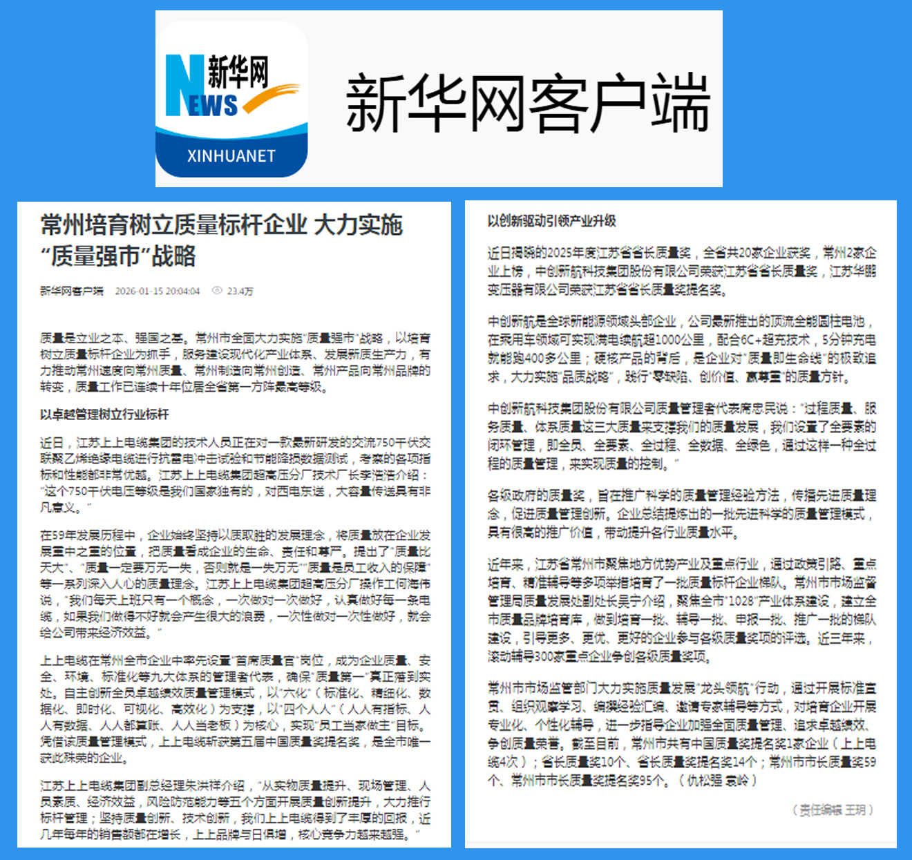 1月15日,新华网客户端以《常州培育树立质量标杆企业 大力实施“质量强市”战略》为题发布报道。